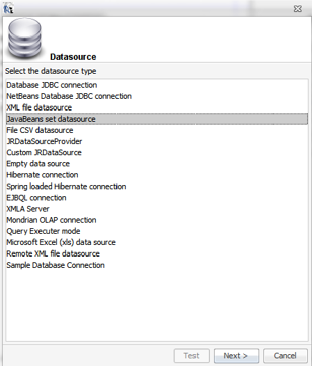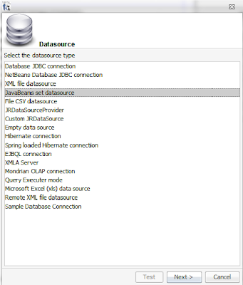 Now create a new datasource by clicking on "Report Datasources" button on toolbar. You will see a window showing the tabular representation of the all existing datasources. Now click on "New" button and you will see datasource types as shown in Diagram 2 below:
